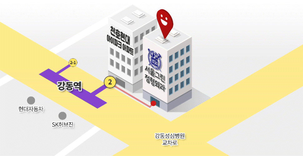 자동차로 오시는 길건물 지하주차장 만차 시천호현대아이파크아파트(옆건물)또는 천호지하주차장(공영)을 이용하여주시면 감사하겠습니다.네비게이션에 [천호현대아이파크 주차장] 또는 [천호지하주차장입구 길동사거리방면] 검색 후 해당 위치로 오시어 주차하세요.